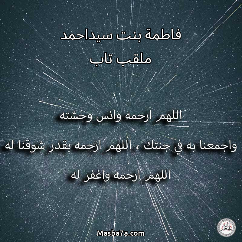 اللهم ارحم ( فاطمة بنت سيداحمد ملقب تاب ) وانس وحشته واجمعنا به في جنتك ، اللهم ارحمه بقدر شوقنا له اللهم ارحمه واغفر له .