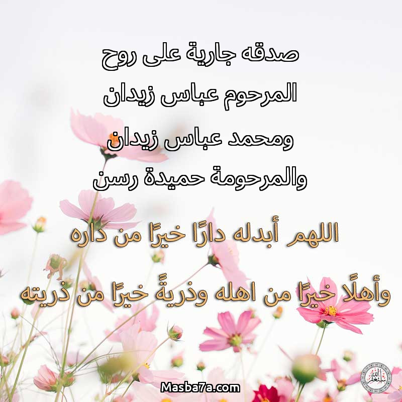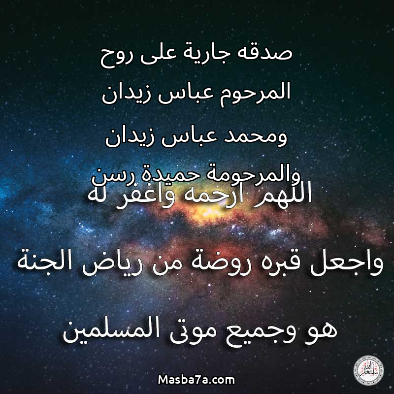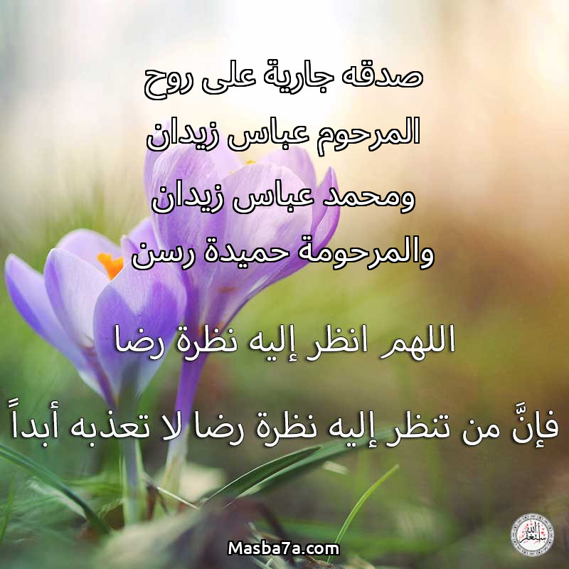 دعاء عن روح المرحوم صدقه جارية على روح المرحوم عباس زيدان ومحمد عباس زيدان والمرحومة حميدة رسن