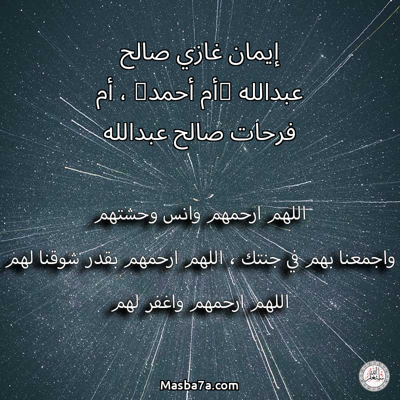 اللهم ارحم ( إيمان غازي صالح عبدالله (أم أحمد) ، أم فرحات صالح عبدالله ) وانس وحشتهم واجمعنا بهم في جنتك ، اللهم ارحمهم بقدر شوقنا لهم اللهم ارحمهم واغفر لهم.