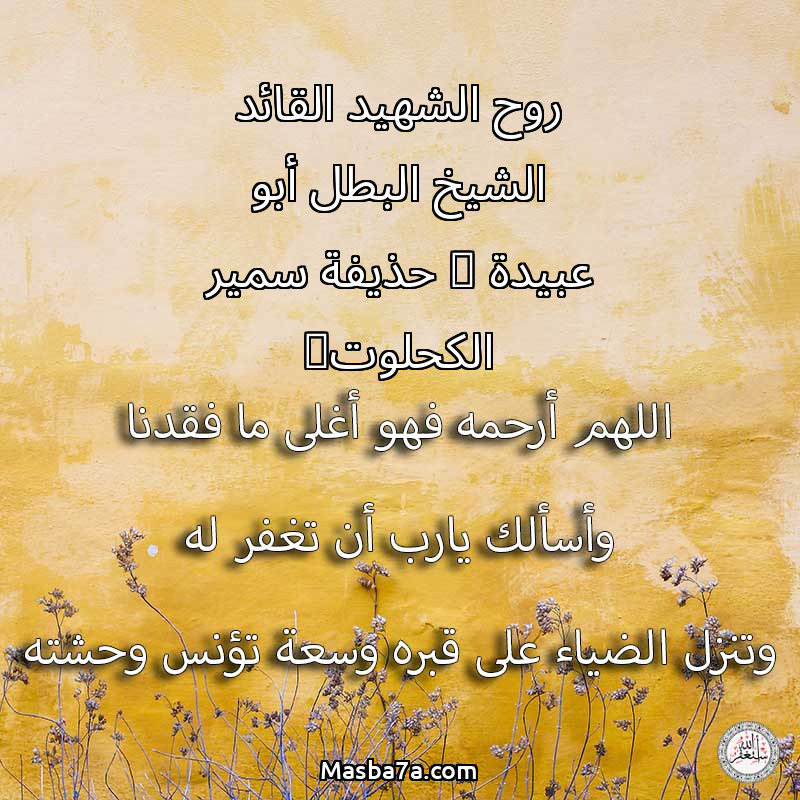 اللهم ارحم ( روح الشهيد القائد الشيخ البطل أبو عبيدة " حذيفة سمير الكحلوت" ) وانس وحشته واجمعنا به في جنتك ، اللهم ارحمه بقدر شوقنا له اللهم ارحمه واغفر له .