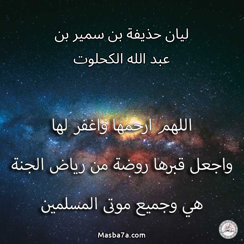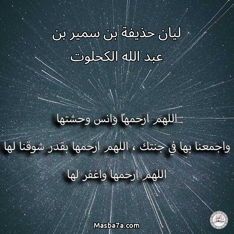 اللهم ارحم ( ليان حذيفة بن سمير بن عبد الله الكحلوت ) وانس وحشتها واجمعنا بها في جنتك ، اللهم ارحمها بقدر شوقنا لها اللهم ارحمها واغفر لها .