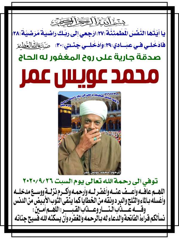 اللهم ارحم ( محمد عويس عمر ) وانس وحشته واجمعنا به في جنتك ، اللهم ارحمه بقدر شوقنا له اللهم ارحمه واغفر له .