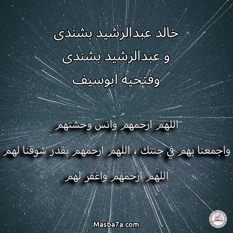 اللهم ارحم ( خالد عبدالرشيد بشندى و عبدالرشيد بشندى وفتحيه ابوسيف ) وانس وحشتهم واجمعنا بهم في جنتك ، اللهم ارحمهم بقدر شوقنا لهم اللهم ارحمهم واغفر لهم.