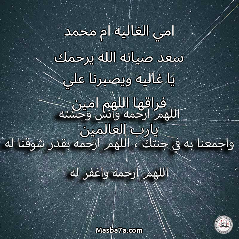 اللهم ارحم ( امي الغاليه ام محمد سعد صيانه الله يرحمك يا غاليه ويصبرنا علي فراقها اللهم امين يارب العالمين ) وانس وحشته واجمعنا به في جنتك ، اللهم ارحمه بقدر شوقنا له اللهم ارحمه واغفر له .