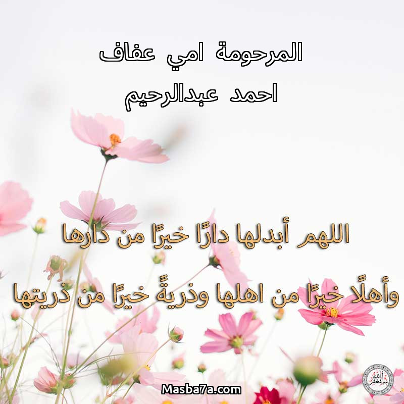 اللهم ارحم ( المرحومة امي عفاف احمد عبدالرحيم ) وانس وحشتها واجمعنا بها في جنتك ، اللهم ارحمها بقدر شوقنا لها اللهم ارحمها واغفر لها .
