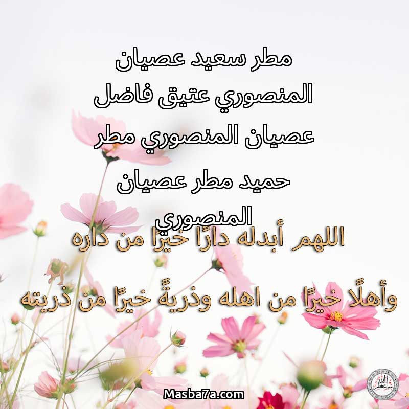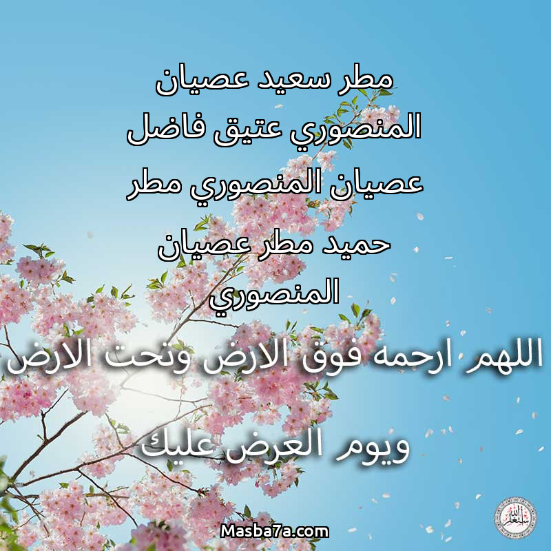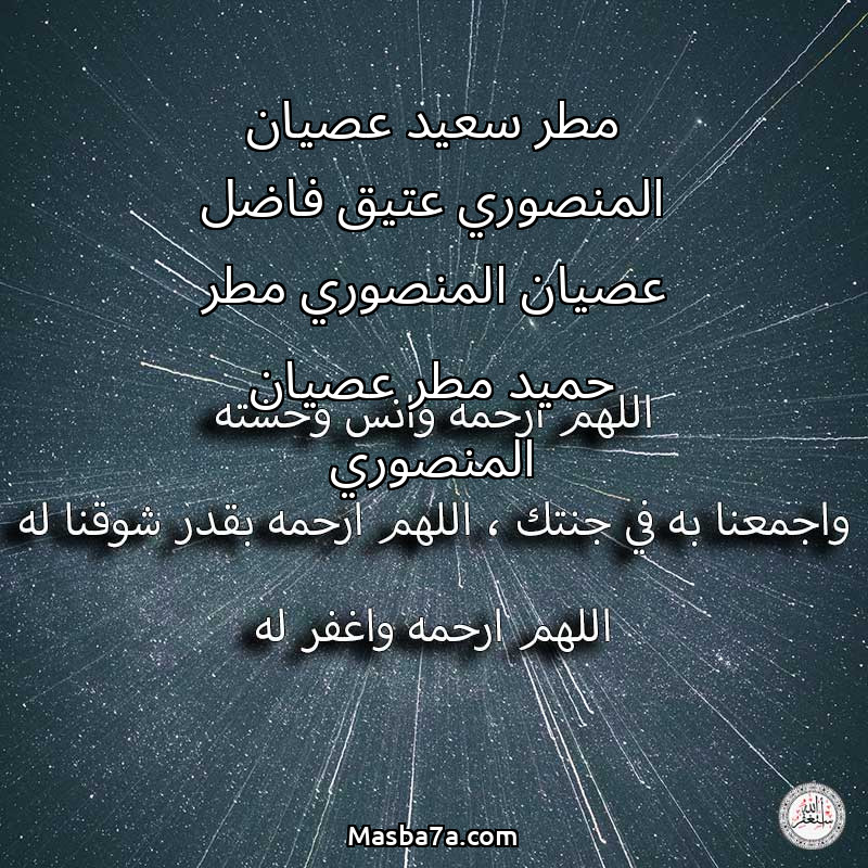 اللهم ارحم ( مطر سعيد عصيان المنصوري عتيق فاضل عصيان المنصوري مطر حميد مطر عصيان المنصوري ) وانس وحشته واجمعنا به في جنتك ، اللهم ارحمه بقدر شوقنا له اللهم ارحمه واغفر له .