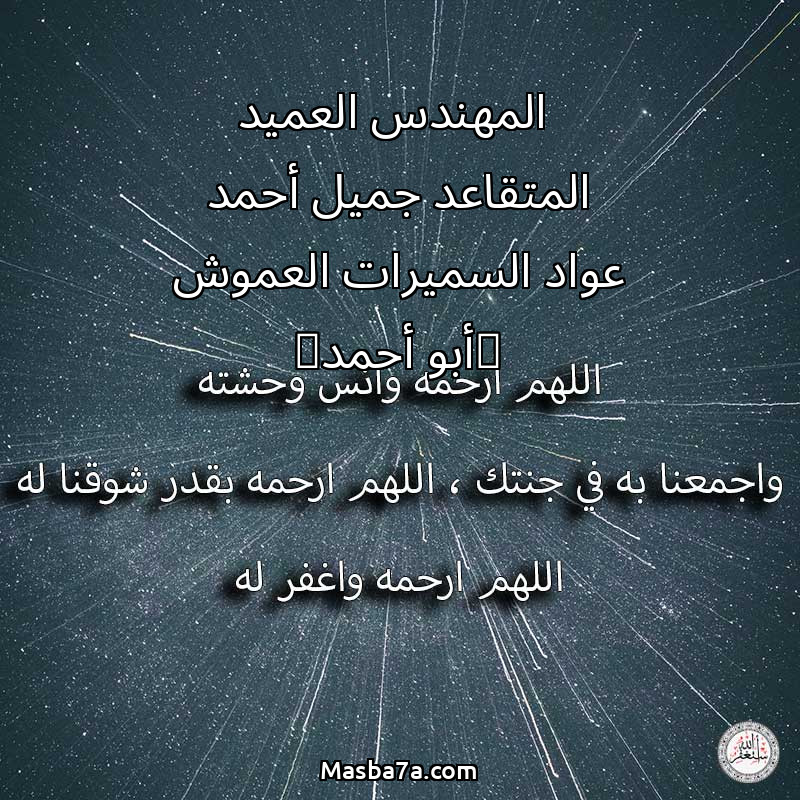 اللهم ارحم ( المهندس العميد المتقاعد جميل أحمد عواد السميرات العموش (أبو أحمد) ) وانس وحشته واجمعنا به في جنتك ، اللهم ارحمه بقدر شوقنا له اللهم ارحمه واغفر له .