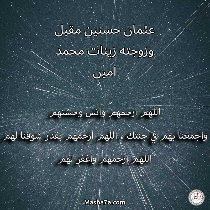 اللهم ارحم ( عثمان حسنين مقبل وزوجته زينات محمد امين ) وانس وحشتهم واجمعنا بهم في جنتك ، اللهم ارحمهم بقدر شوقنا لهم اللهم ارحمهم واغفر لهم.