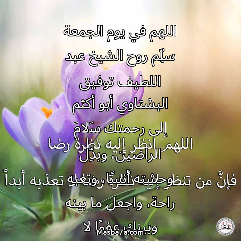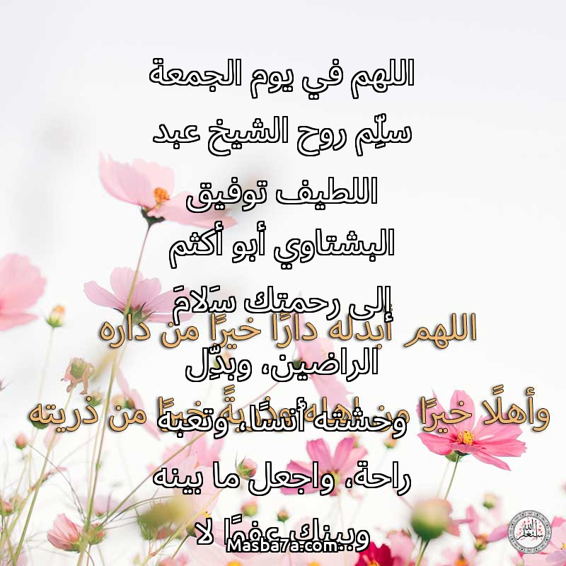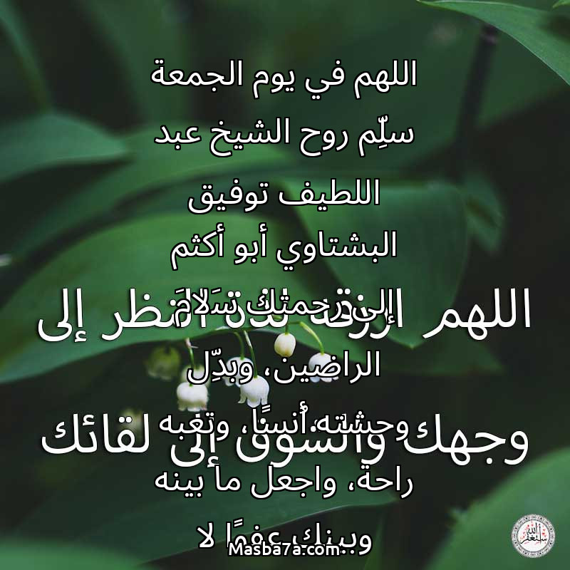 دعاء عن روح المرحوم اللهم في يوم الجمعة سلِّم روح الشيخ عبد اللطيف توفيق البشتاوي أبو أكثم إلى رحمتك سَلامَ الراضين، وبدِّل وحشته أُنسًا، وتعبه راحة، واجعل ما بينه وبينك عفوًا لا يُغلق، ونورًا لا ينطفئ، واكتب له لقاءً كريمًا بك، ومقامَ صدقٍ في جناتك، إنك أرحم به منّا جميعًا