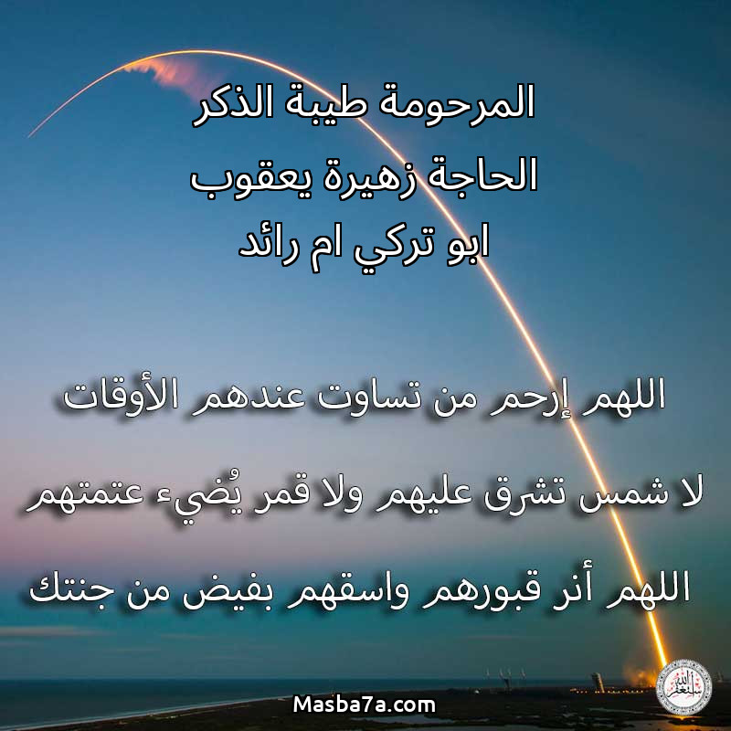 اللهم ارحم ( المرحومة طيبة الذكر الحاجة زهيرة يعقوب ابو تركي ام رائد ) وانس وحشتها واجمعنا بها في جنتك ، اللهم ارحمها بقدر شوقنا لها اللهم ارحمها واغفر لها .