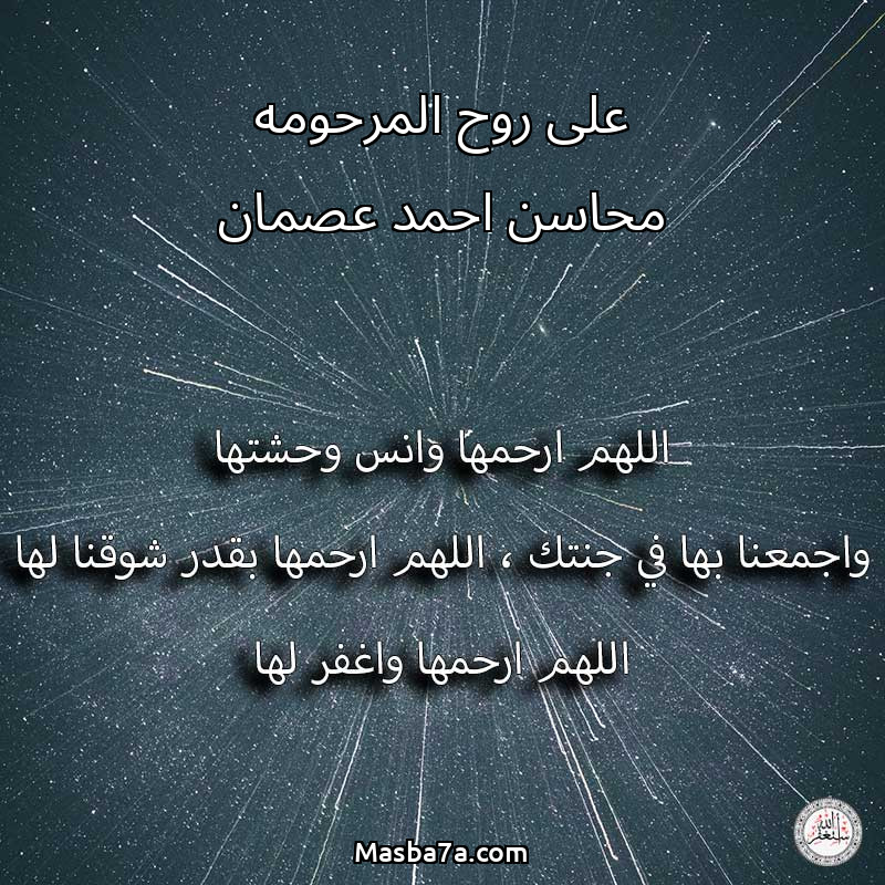 اللهم ارحم ( على روح المرحومه محاسن احمد عصمان ) وانس وحشتها واجمعنا بها في جنتك ، اللهم ارحمها بقدر شوقنا لها اللهم ارحمها واغفر لها .