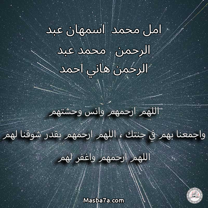اللهم ارحم ( امل محمد -اسمهان عبد الرحمن - محمد عبد الرحمن هاني احمد ) وانس وحشتهم واجمعنا بهم في جنتك ، اللهم ارحمهم بقدر شوقنا لهم اللهم ارحمهم واغفر لهم.