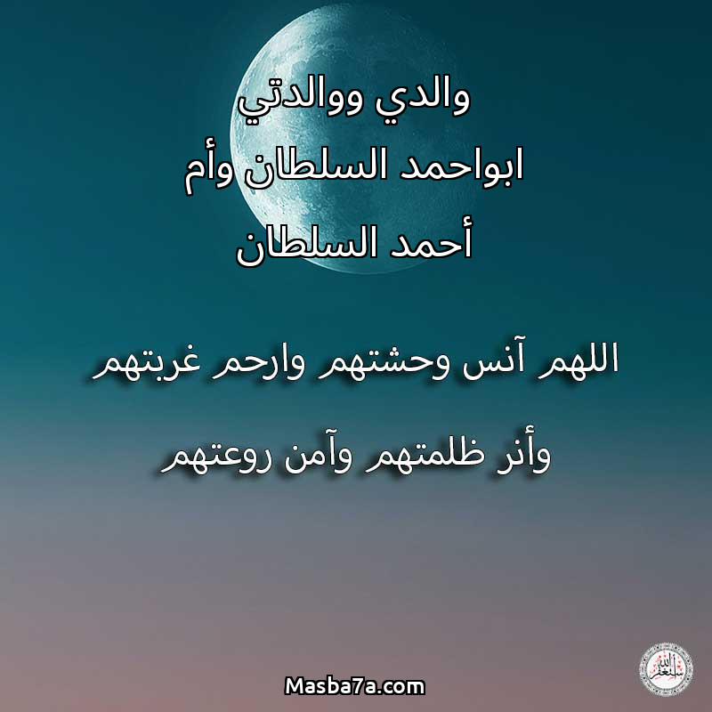 اللهم ارحم ( والدي ووالدتي ابواحمد السلطان وأم أحمد السلطان ) وانس وحشتهم واجمعنا بهم في جنتك ، اللهم ارحمهم بقدر شوقنا لهم اللهم ارحمهم واغفر لهم.