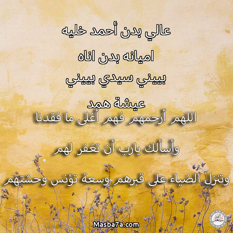 اللهم ارحم ( عالي بدن أحمد خليه اميانه بدن اناه بييني سيدي بييني عيشة همد ) وانس وحشتهم واجمعنا بهم في جنتك ، اللهم ارحمهم بقدر شوقنا لهم اللهم ارحمهم واغفر لهم.
