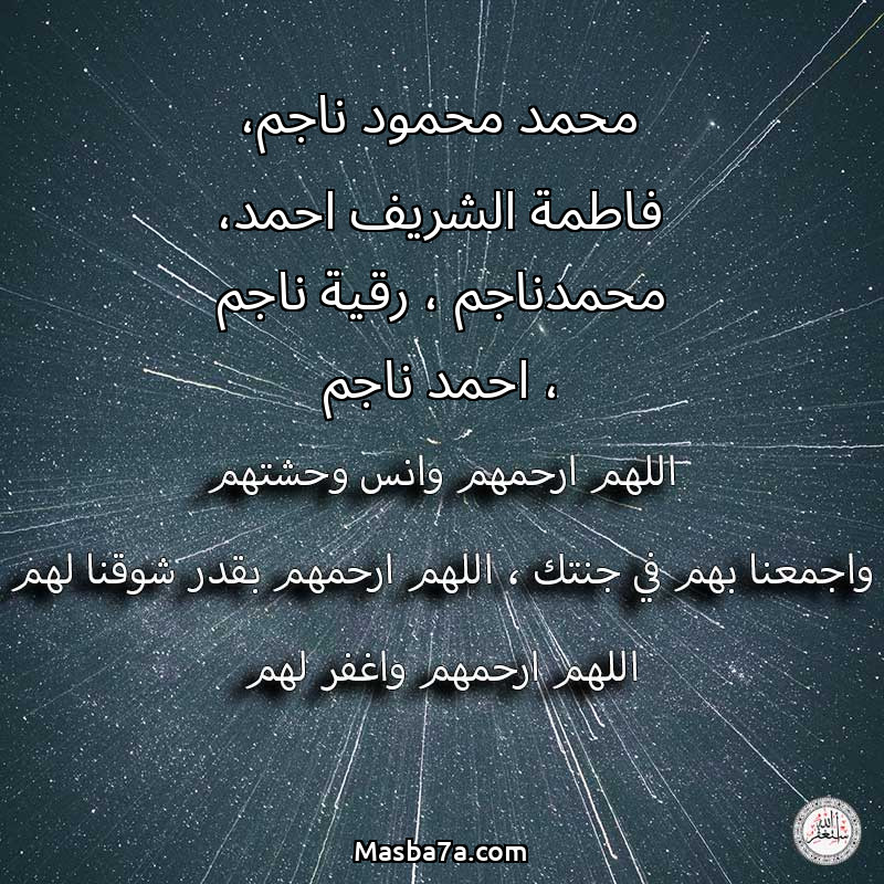 اللهم ارحم ( محمد محمود ناجم، فاطمة الشريف احمد، محمدناجم ، رقية ناجم ، احمد ناجم ) وانس وحشتهم واجمعنا بهم في جنتك ، اللهم ارحمهم بقدر شوقنا لهم اللهم ارحمهم واغفر لهم.