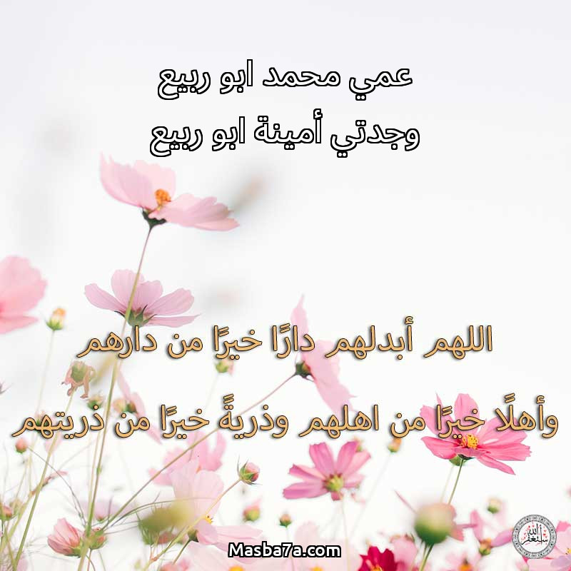 اللهم ارحم ( عمي محمد ابو ربيع وجدتي أمينة ابو ربيع ) وانس وحشتهم واجمعنا بهم في جنتك ، اللهم ارحمهم بقدر شوقنا لهم اللهم ارحمهم واغفر لهم.