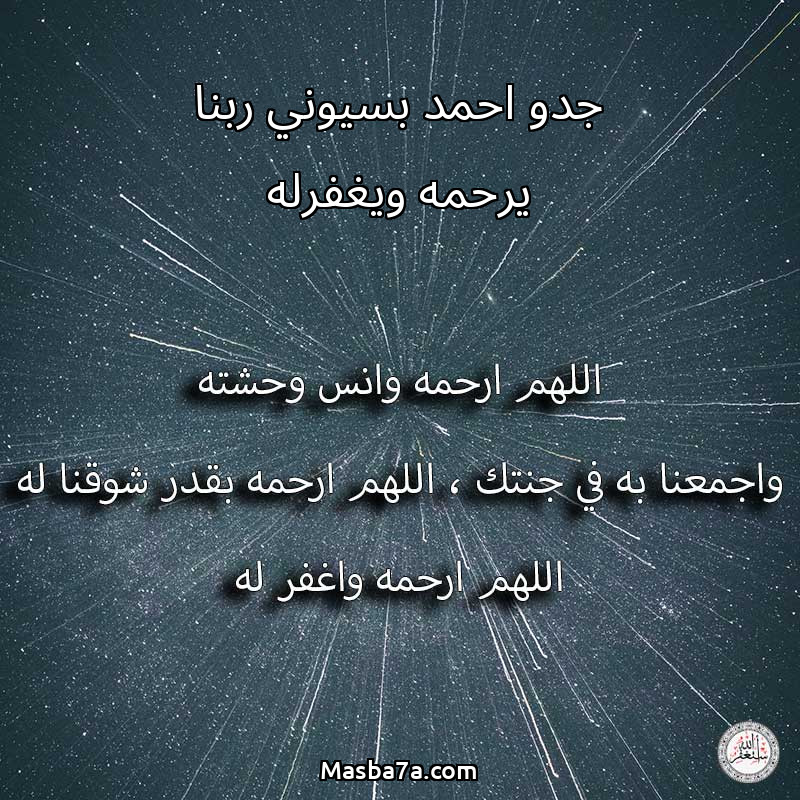 اللهم ارحم ( جدو احمد بسيوني ربنا يرحمه ويغفرله ) وانس وحشته واجمعنا به في جنتك ، اللهم ارحمه بقدر شوقنا له اللهم ارحمه واغفر له .