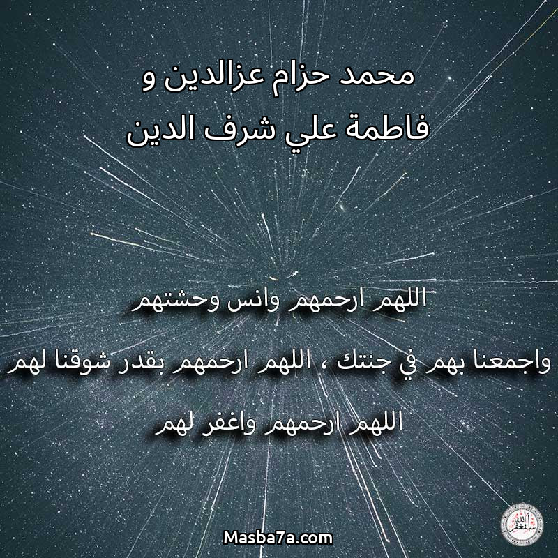 اللهم ارحم ( محمد حزام عزالدين و فاطمة علي شرف الدين ) وانس وحشتهم واجمعنا بهم في جنتك ، اللهم ارحمهم بقدر شوقنا لهم اللهم ارحمهم واغفر لهم.