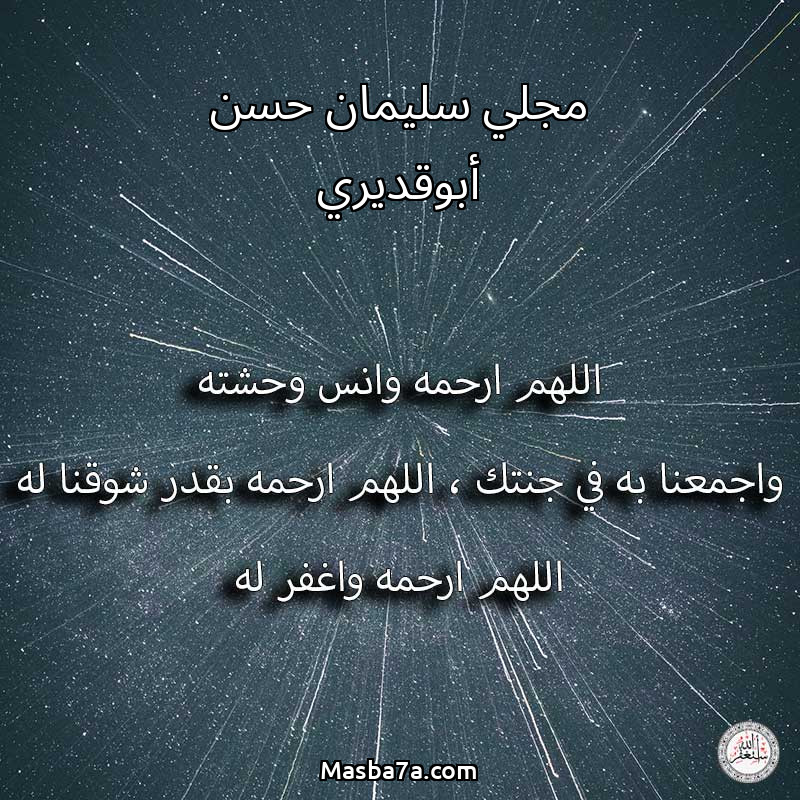 اللهم ارحم ( مجلي سليمان حسن أبوقديري ) وانس وحشته واجمعنا به في جنتك ، اللهم ارحمه بقدر شوقنا له اللهم ارحمه واغفر له .