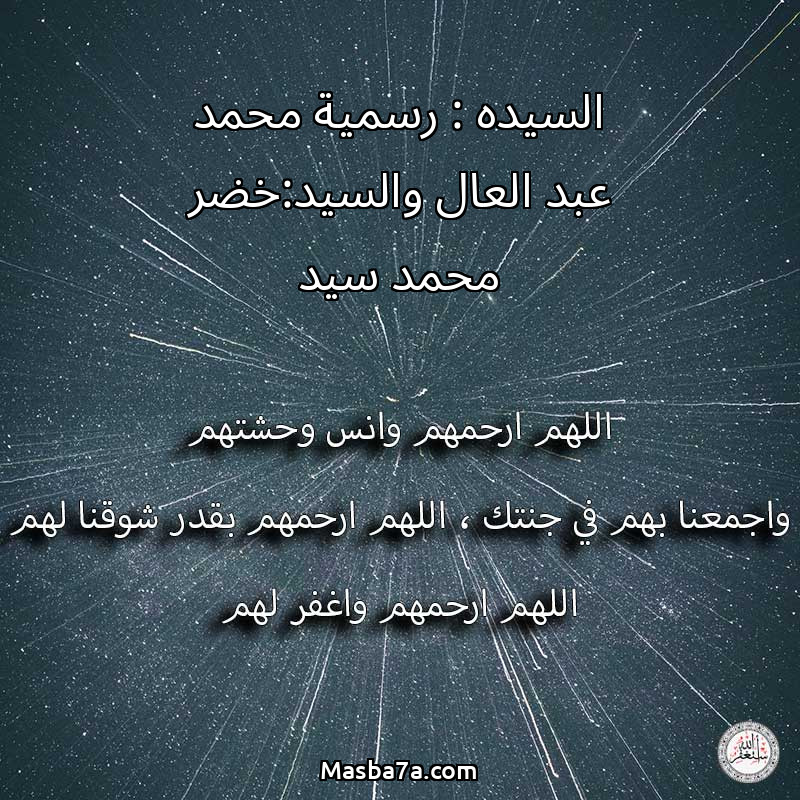 اللهم ارحم ( السيده : رسمية محمد عبد العال والسيد:خضر محمد سيد ) وانس وحشتهم واجمعنا بهم في جنتك ، اللهم ارحمهم بقدر شوقنا لهم اللهم ارحمهم واغفر لهم.