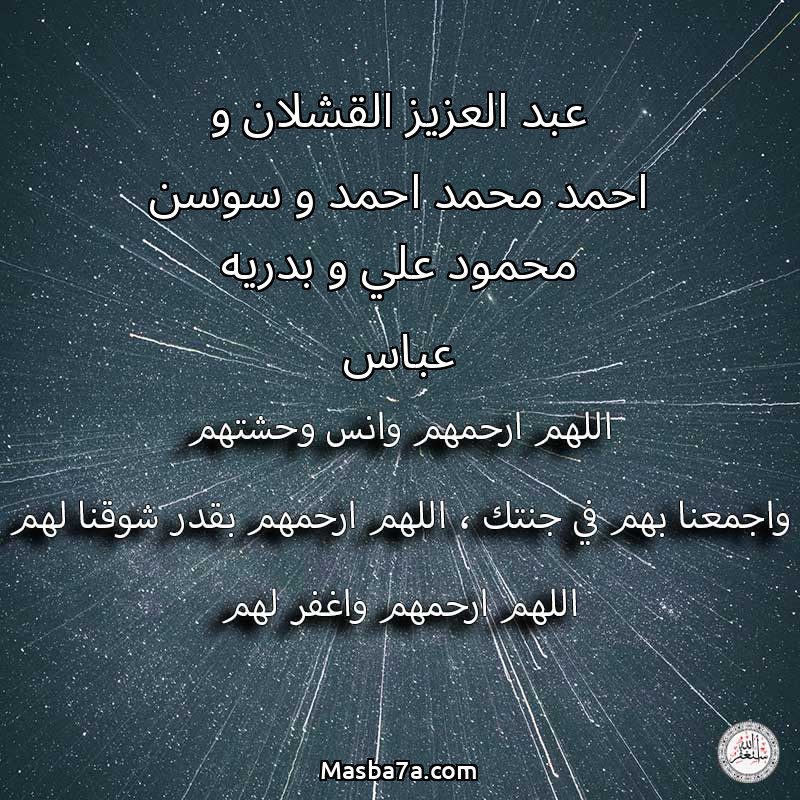 اللهم ارحم ( عبد العزيز القشلان و احمد محمد احمد و سوسن محمود علي و بدريه عباس ) وانس وحشتهم واجمعنا بهم في جنتك ، اللهم ارحمهم بقدر شوقنا لهم اللهم ارحمهم واغفر لهم.