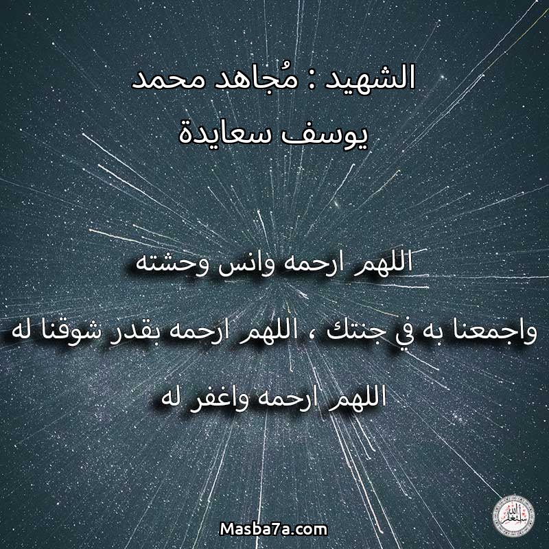 اللهم ارحم ( الشهيد : مُجاهد محمد يوسف سعايدة ) وانس وحشته واجمعنا به في جنتك ، اللهم ارحمه بقدر شوقنا له اللهم ارحمه واغفر له .