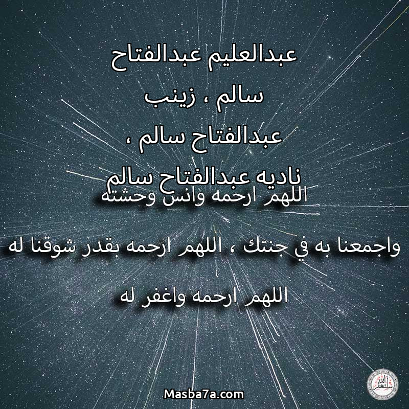 اللهم ارحم ( عبدالعليم عبدالفتاح سالم ، زينب عبدالفتاح سالم ، ناديه عبدالفتاح سالم ) وانس وحشته واجمعنا به في جنتك ، اللهم ارحمه بقدر شوقنا له اللهم ارحمه واغفر له .