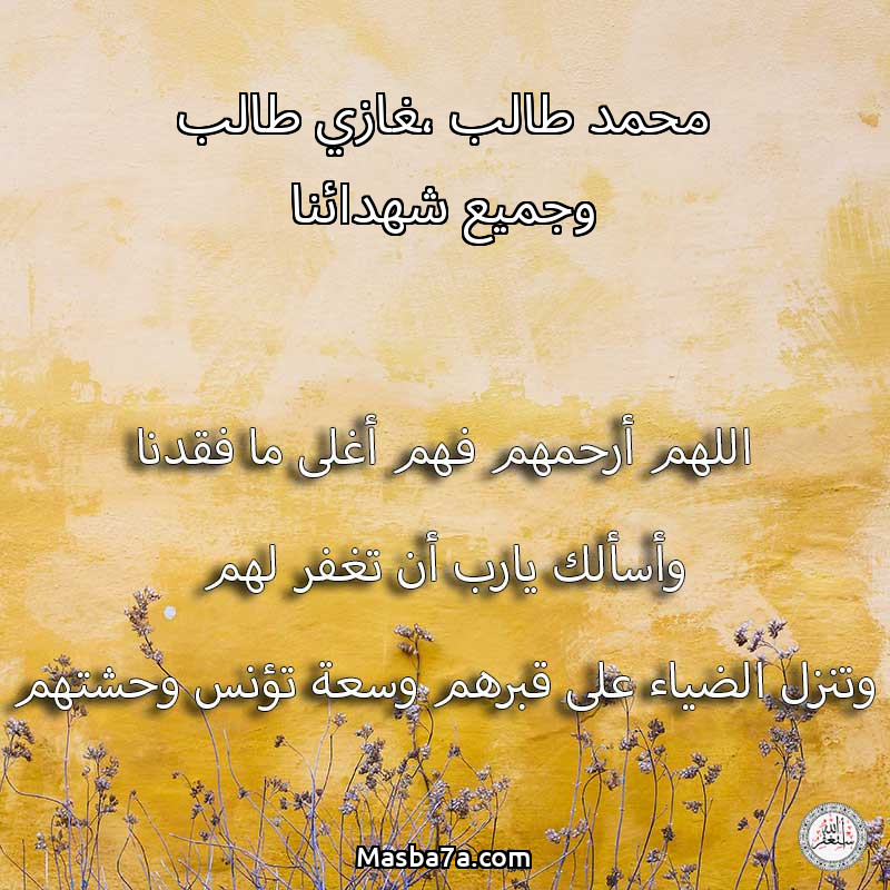 اللهم ارحم ( محمد طالب ،غازي طالب وجميع شهدائنا ) وانس وحشتهم واجمعنا بهم في جنتك ، اللهم ارحمهم بقدر شوقنا لهم اللهم ارحمهم واغفر لهم.