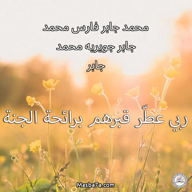 اللهم ارحم ( محمد جابر فارس محمد جابر جويريه محمد جابر ) وانس وحشتهم واجمعنا بهم في جنتك ، اللهم ارحمهم بقدر شوقنا لهم اللهم ارحمهم واغفر لهم.