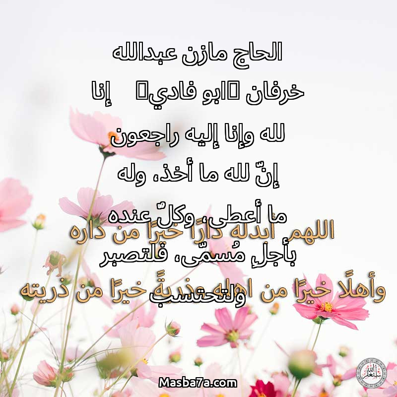 دعاء عن روح المرحوم الحاج مازن عبدالله خرفان (ابو فادي) إنا لله وإنا إليه راجعون إنَّ لله ما أخذ، وله ما أعطى، وكلٌّ عنده بأجلٍ مُسمّى، فلتصبر ولتحتسب