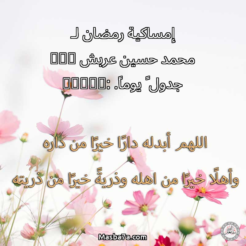 اللهم ارحم ( إمساكية رمضان لـ محمد حسين عربش — جدول ٣٠ يوماً. https://istighfar.net/ar/imsakiya/imsakiya-1772محمد حسين فهد عربش ) وانس وحشته واجمعنا به في جنتك ، اللهم ارحمه بقدر شوقنا له اللهم ارحمه واغفر له .