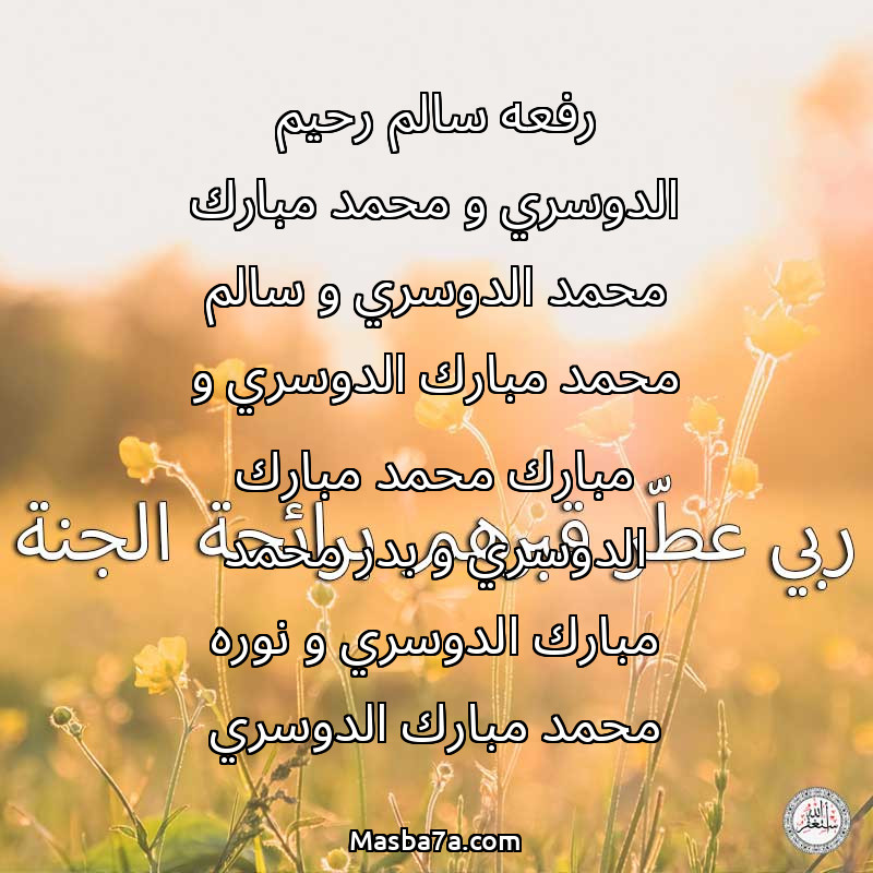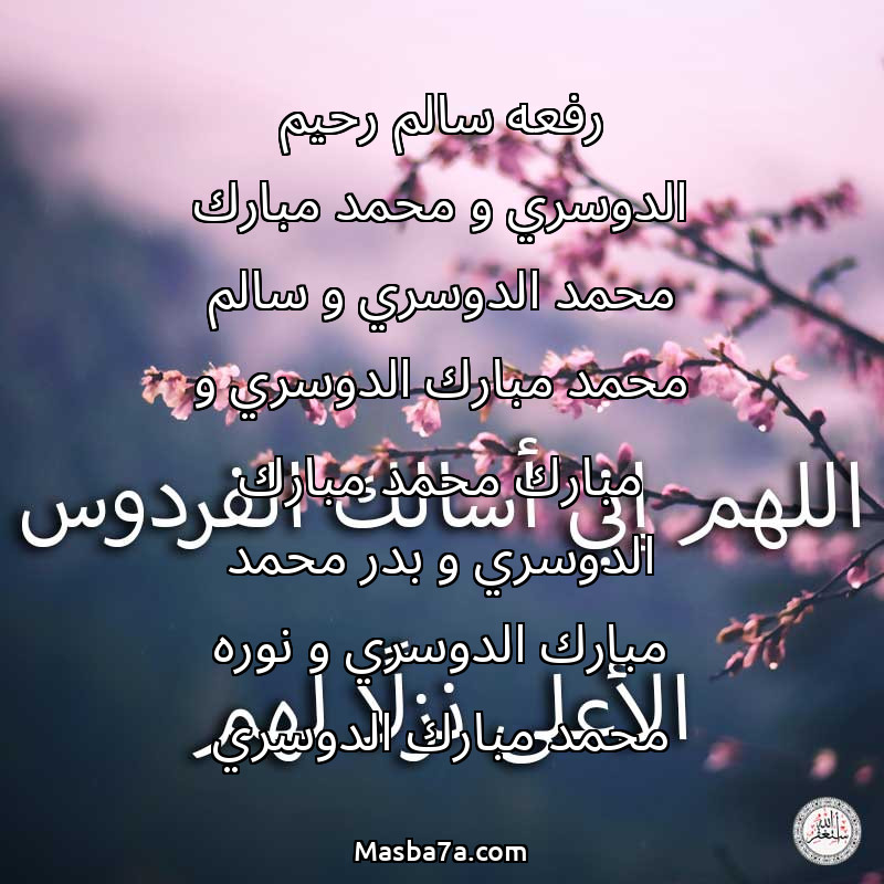 دعاء عن أرواح المرحومين رفعه سالم رحيم الدوسري و محمد مبارك محمد الدوسري و سالم محمد مبارك الدوسري و مبارك محمد مبارك الدوسري و بدر محمد مبارك الدوسري و نوره محمد مبارك الدوسري