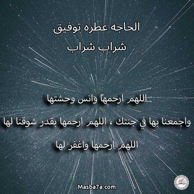 اللهم ارحم ( الحاجه عطره توفيق شراب شراب ) وانس وحشتها واجمعنا بها في جنتك ، اللهم ارحمها بقدر شوقنا لها اللهم ارحمها واغفر لها .