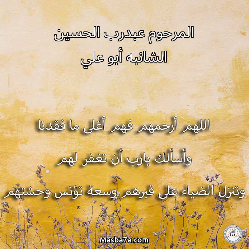 اللهم ارحم ( المرحوم عبدرب الحسين الشانبه أبو علي / المرحومة فاطمة الشانبه أم علي ) وانس وحشتهم واجمعنا بهم في جنتك ، اللهم ارحمهم بقدر شوقنا لهم اللهم ارحمهم واغفر لهم.