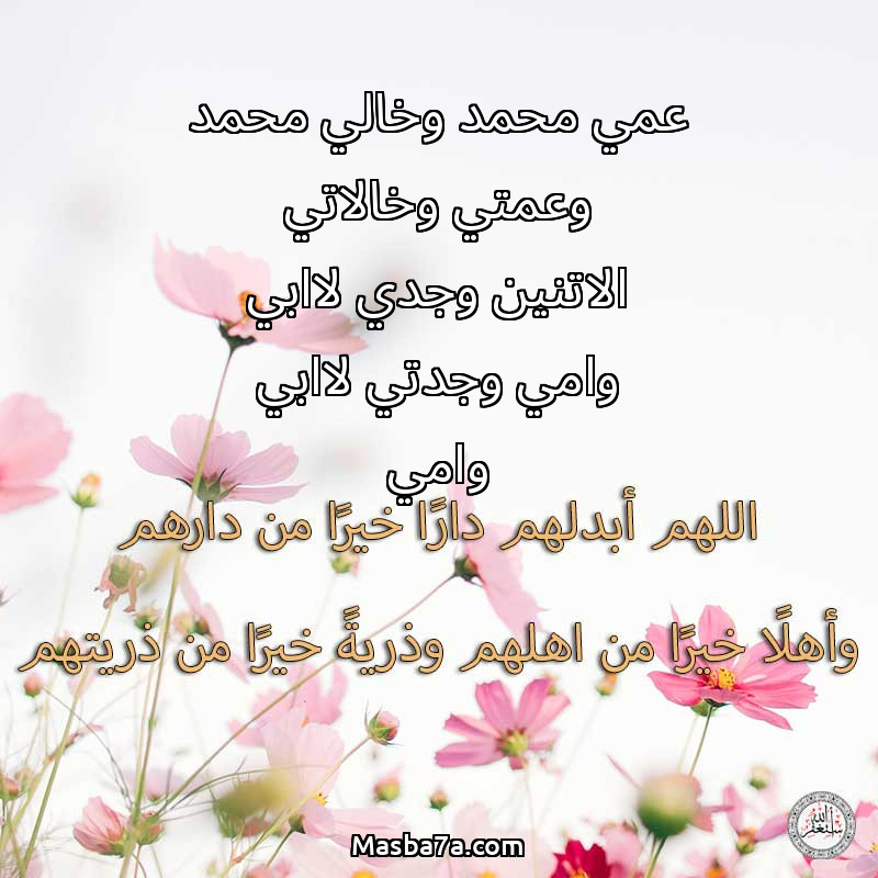 اللهم ارحم ( عمي محمد وخالي محمد وعمتي وخالاتي الاتنين وجدي لاابي وامي وجدتي لاابي وامي ) وانس وحشتهم واجمعنا بهم في جنتك ، اللهم ارحمهم بقدر شوقنا لهم اللهم ارحمهم واغفر لهم.
