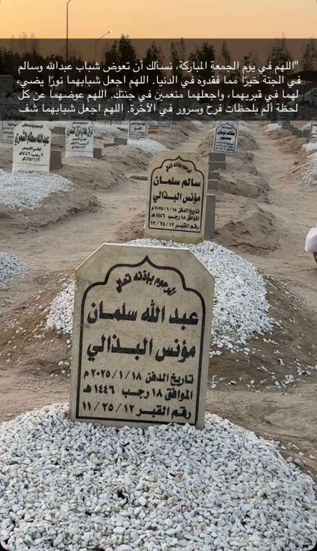 اللهم ارحم ( سالم سلمان البذالي - عبدالله سلمان البذالي ) وانس وحشتهم واجمعنا بهم في جنتك ، اللهم ارحمهم بقدر شوقنا لهم اللهم ارحمهم واغفر لهم.
