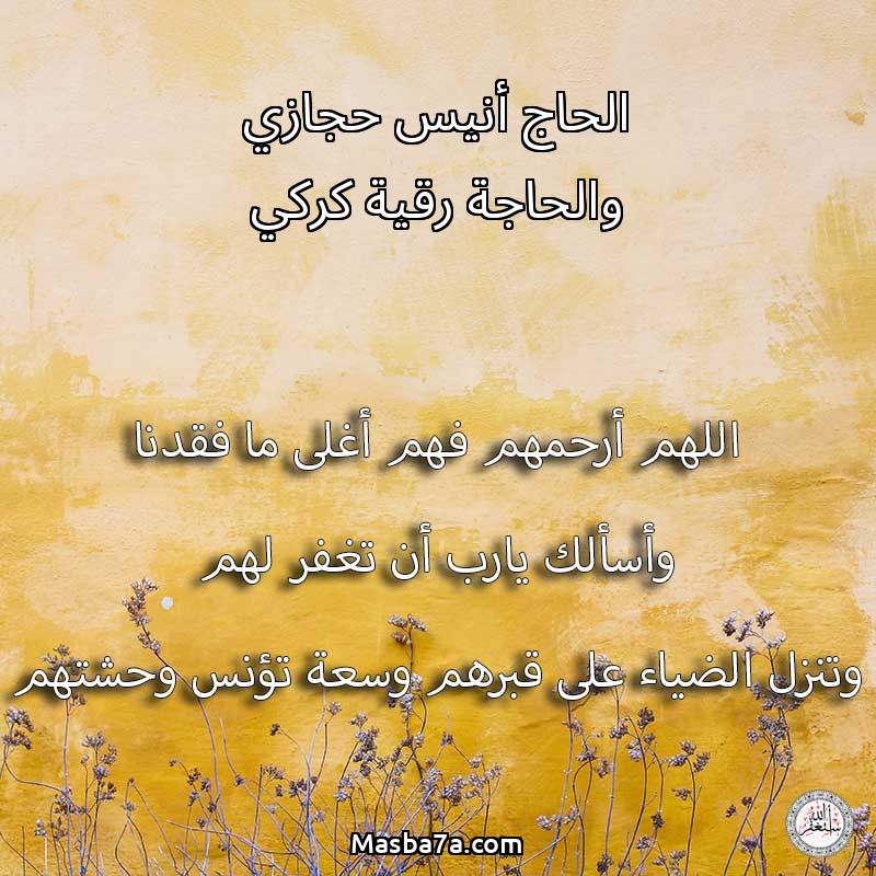 اللهم ارحم ( الحاج أنيس حجازي والحاجة رقية كركي ) وانس وحشتهم واجمعنا بهم في جنتك ، اللهم ارحمهم بقدر شوقنا لهم اللهم ارحمهم واغفر لهم.