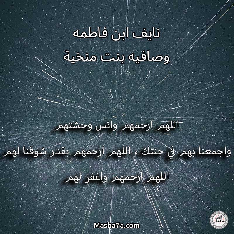 اللهم ارحم ( نايف ابن فاطمه وصافيه بنت منخية ) وانس وحشتهم واجمعنا بهم في جنتك ، اللهم ارحمهم بقدر شوقنا لهم اللهم ارحمهم واغفر لهم.