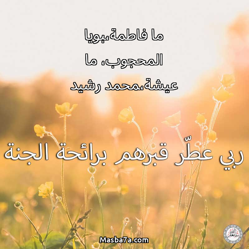 اللهم ارحم ( ما فاطمة،بويا المحجوب، ما عيشة،محمد رشيد ) وانس وحشتهم واجمعنا بهم في جنتك ، اللهم ارحمهم بقدر شوقنا لهم اللهم ارحمهم واغفر لهم.