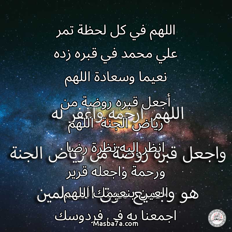 اللهم في كل لحظة تمر علي محمد في قبره زده نعيما وسعادة اللهم أجعل قبره روضة من رياض الجنة اللهم انظر إليه نظرة رضا ورحمة واجعله قرير العين بنعيمك اللهم اجمعنا به في فردوسك الاعلى من غير حساب ولا سابقة عذاب بحولك وقوتك يا رحمن يا رحيم اللهم ارحم محمد عدد ما صلى عبادك وعدد ما رفعت الايادي لدعاءك اللهم اغفر له يا واسع المغفرة وادخله فسيح جناتك