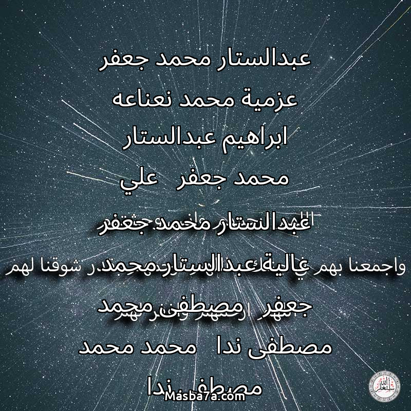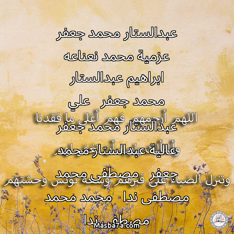 اللهم ارحم ( عبدالستار محمد جعفر- عزمية محمد نعناعه- ابراهيم عبدالستار محمد جعفر - علي عبدالستار محمد جعفر - عالية عبدالستار محمد جعفر - مصطفى محمد مصطفى ندا - محمد محمد مصطفى ندا ) وانس وحشتهم واجمعنا بهم في جنتك ، اللهم ارحمهم بقدر شوقنا لهم اللهم ارحمهم واغفر لهم.