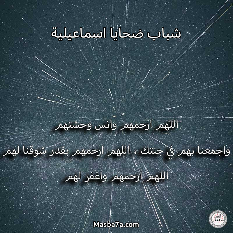 اللهم ارحم ( شباب ضحايا اسماعيلية ) وانس وحشتهم واجمعنا بهم في جنتك ، اللهم ارحمهم بقدر شوقنا لهم اللهم ارحمهم واغفر لهم.