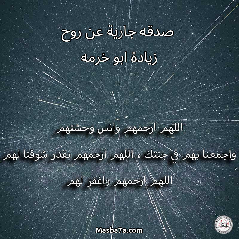 اللهم ارحم ( صدقه جارية عن روح زيادة ابو خرمه ) وانس وحشتهم واجمعنا بهم في جنتك ، اللهم ارحمهم بقدر شوقنا لهم اللهم ارحمهم واغفر لهم.