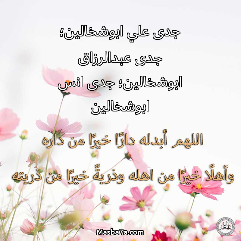 اللهم ارحم ( جدى علي ابوشخالين؛ جدى عبدالرزاق ابوشخالين؛ جدى انس ابوشخالين ) وانس وحشته واجمعنا به في جنتك ، اللهم ارحمه بقدر شوقنا له اللهم ارحمه واغفر له .