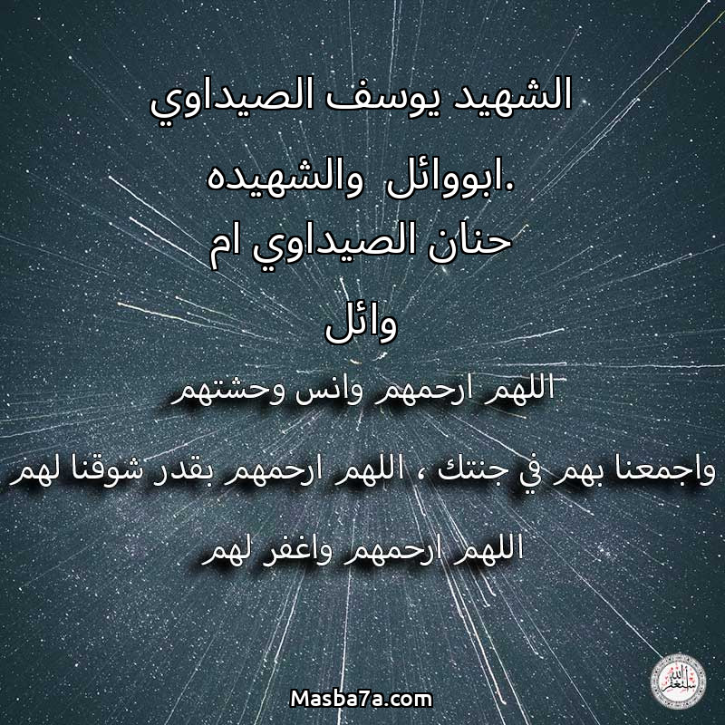 اللهم ارحم ( الشهيد يوسف الصيداوي .ابووائل والشهيده حنان الصيداوي ام وائل ) وانس وحشتهم واجمعنا بهم في جنتك ، اللهم ارحمهم بقدر شوقنا لهم اللهم ارحمهم واغفر لهم.