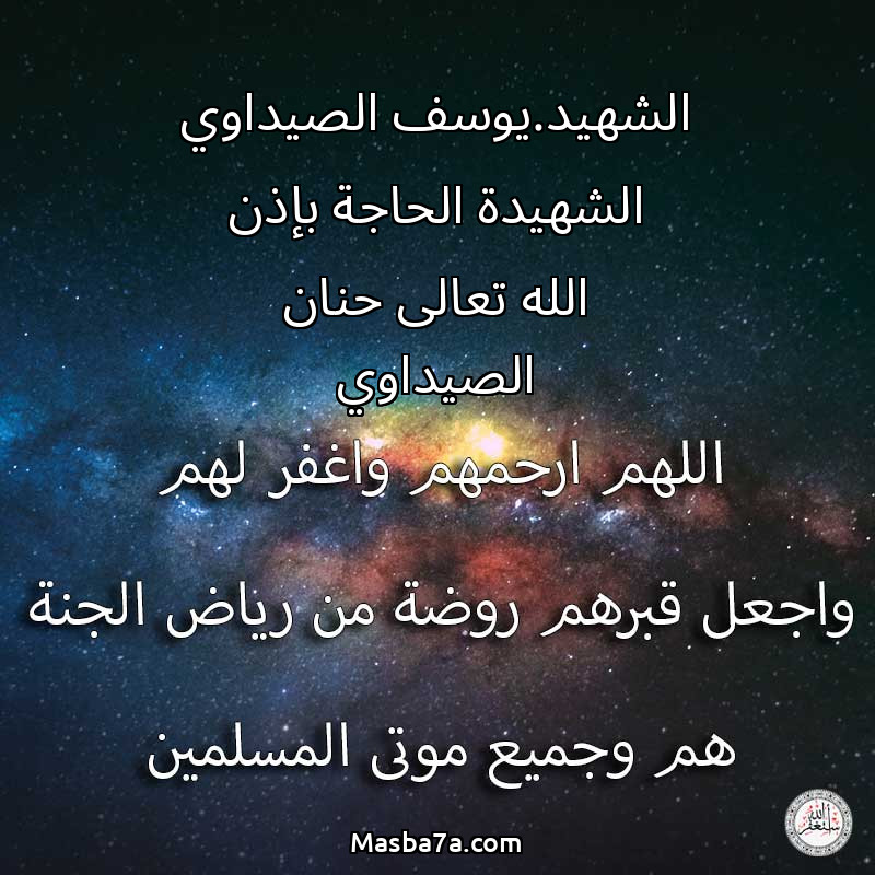 اللهم ارحم ( الشهيد.يوسف الصيداوي الشهيدة الحاجة بإذن الله تعالى حنان الصيداوي ) وانس وحشتهم واجمعنا بهم في جنتك ، اللهم ارحمهم بقدر شوقنا لهم اللهم ارحمهم واغفر لهم.