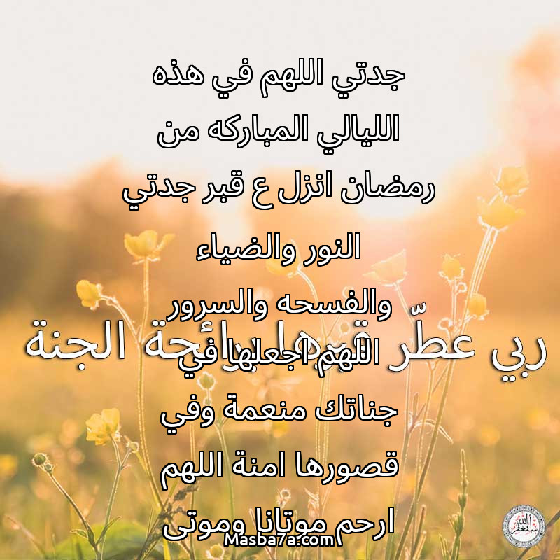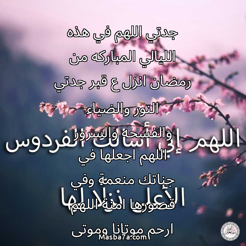 دعاء عن روح المرحومة جدتي اللهم في هذه الليالي المباركه من رمضان انزل ع قبر جدتي النور والضياء والفسحه والسرور اللهم اجعلها في جناتك منعمة وفي قصورها امنة اللهم ارحم موتانا وموتى المسلمين يارب
