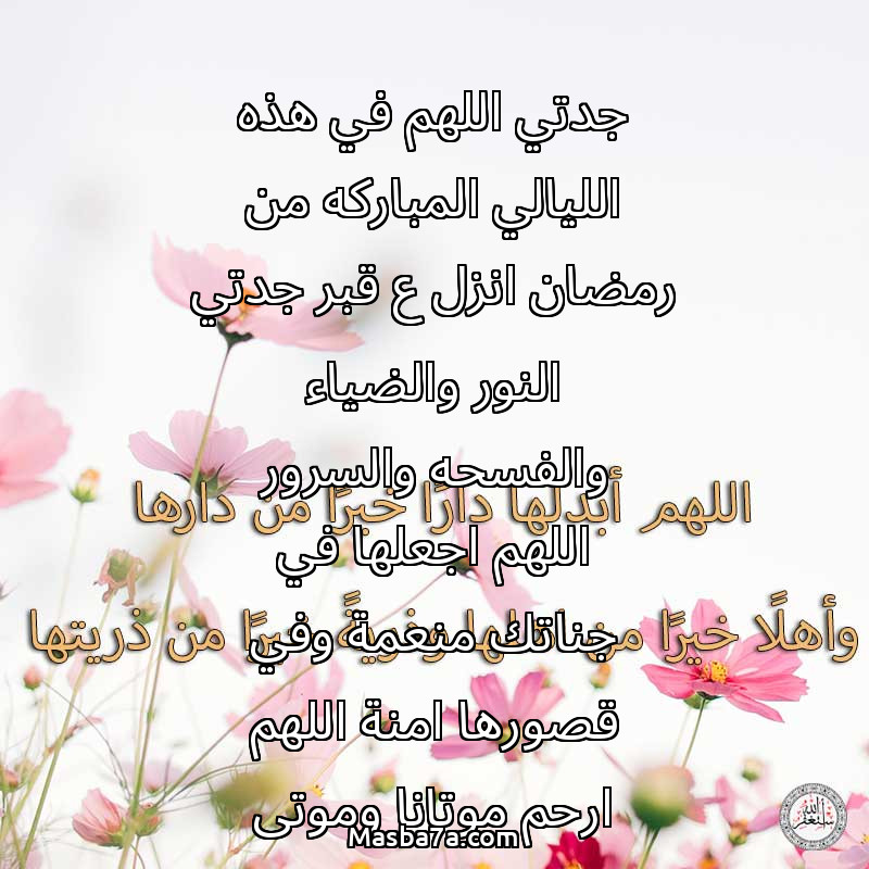 دعاء عن روح المرحومة جدتي اللهم في هذه الليالي المباركه من رمضان انزل ع قبر جدتي النور والضياء والفسحه والسرور اللهم اجعلها في جناتك منعمة وفي قصورها امنة اللهم ارحم موتانا وموتى المسلمين يارب