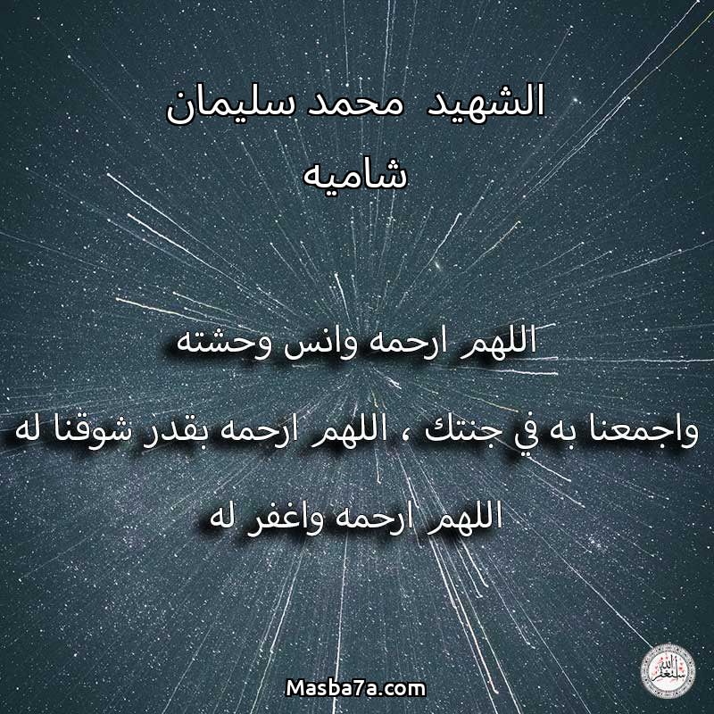اللهم ارحم ( الشهيد محمد سليمان شاميه ) وانس وحشته واجمعنا به في جنتك ، اللهم ارحمه بقدر شوقنا له اللهم ارحمه واغفر له .