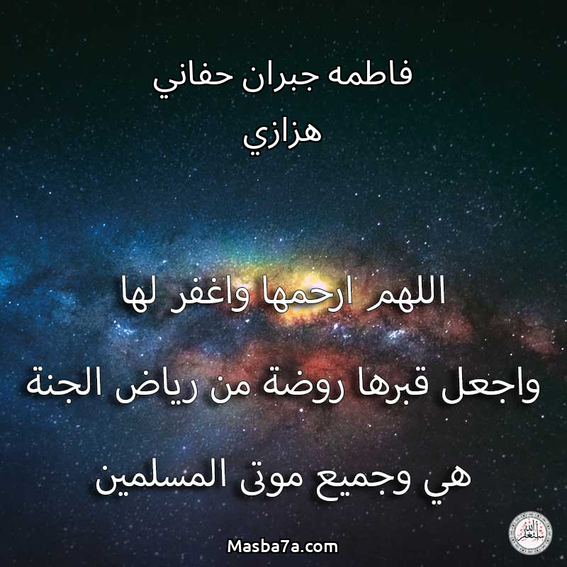 اللهم ارحم ( فاطمه جبران حفاني هزازي ) وانس وحشتها واجمعنا بها في جنتك ، اللهم ارحمها بقدر شوقنا لها اللهم ارحمها واغفر لها .